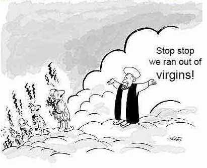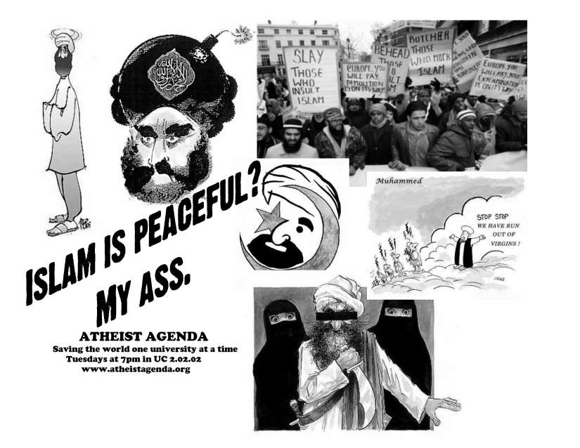 From the “holy” Quran:2:191-193 – "And slay them wherever ye find them, and drive them out of the places whence they drove you out, for persecution [of Muslims] is worse than slaughter [of non-believers]…and fight them until persecution is no more, and religion is for Allah."2:216 – "Fighting is prescribed for you, and ye dislike it. But it is possible that ye dislike a thing which is good for you, and that ye love a thing which is bad for you. But Allah knoweth, and ye know not." 2:244 – "Then fight in the cause of Allah, and know that Allah Heareth and knoweth all things." 5:33 - "The punishment of those who wage war against Allah and His messenger and strive to make mischief in the land is only this, that they should be murdered or crucified or their hands and their feet should be cut off on opposite sides or they should be imprisoned; this shall be as a disgrace for them in this world, and in the hereafter they shall have a grievous chastisement." 8:12 – "Remember thy Lord inspired the angels (with the message): "I am with you: give firmness to the Believers: I will instil terror into the hearts of the Unbelievers: smite ye above their necks and smite all their finger-tips off them." 8:55 - "Surely the vilest of animals in Allah's sight are those who disbelieve." 9:5 - "fight and slay the pagans (or infidels or unbelievers) wherever you find them." 9:29 – "Fight those who believe not in Allah nor the Last Day, nor hold that forbidden which hath been forbidden by Allah and His Messenger, nor acknowledge the religion of Truth, (even if they are) of the People of the Book, until they pay the Jizya with willing submission, and feel themselves subdued." 9:30 - "And the Jews say: Ezra is the son of Allah, and the Christians say: The Messiah is the son of Allah... Allah (Himself) fights against them. How perverse are they!" 9:41 – "Go forth, light-armed and heavy-armed, and strive with your wealth and your lives in the way of Allah! That is best for you if ye but knew." 9:73 – "O Prophet! strive hard against the unbelievers and the hypocrites and be unyielding to them; and their abode is hell, and evil is the destination." 9:88 – "But the Messenger, and those who believe with him, strive and fight with their wealth and their persons: for them are (all) good things: and it is they who will prosper." 9:111 – "Allah hath purchased of the believers their persons and their goods; for theirs (in return) is the garden (of Paradise): they fight in His cause, and slay and are slain: apromise binding on Him in truth, through the Law, the Gospel, and the Quran: and who is more faithful to his covenant than Allah? then rejoice in the bargain which ye have concluded: that is the achievement supreme." 9:123 – "O you who believe! fight those of the unbelievers who are near to you and let them find in you hardness." 25:52 – "Therefore listen not to the Unbelievers, but strive against them with the utmost strenuousness…" 47:3-4 – "Those who reject Allah follow vanities, while those who believe follow the truth from their lord. Thus does Allah set forth form men their lessons by similtudes. Therefore when you meet in battle those who disbelieve, then smite the necks until when you have overcome them, then make (them) prisoners," 61:9 - "He it is who has sent His Messenger (Mohammed) with guidance and the religion of truth (Islam) to make it victorious over all religions even though the infidels may resist." 66:9 – "O Prophet! Strive against the disbelievers and the hypocrites, and be stern with them. Hell will be their home, a hapless journey’s end."